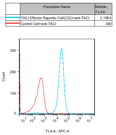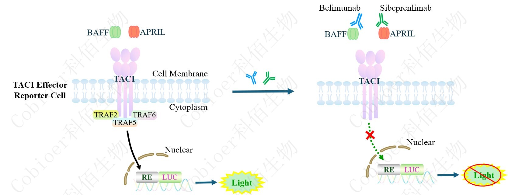 TACI Effector Reporter Cell 報告基因藥靶模型很好的模擬了體內 TACI 的信號轉導過程, 原理見下圖所示。![]() Figure 1. TACI Effector Reporter Cell 模型原理圖 |
