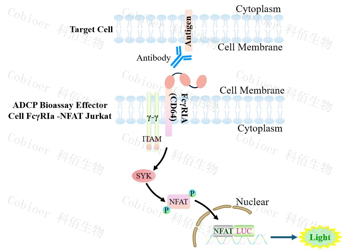 ADCP Bioassay Effector Cell FcγRIa -NFAT Jurkat 報(bào)告基因藥靶模型很好的模擬了體內(nèi) ADCP 的信號(hào)轉(zhuǎn)導(dǎo)過(guò)程,原理見下圖所示。