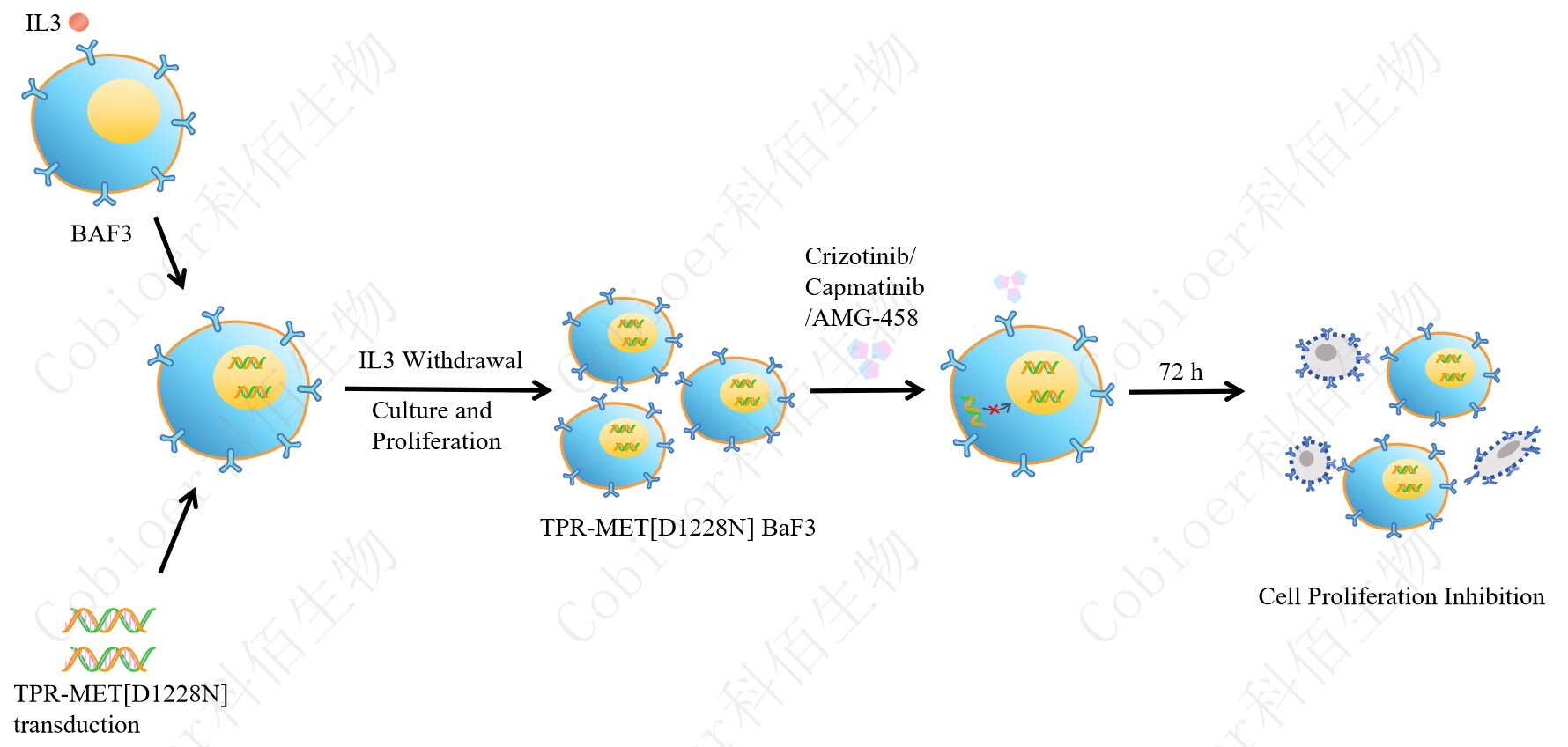 BaF3(小鼠原 B 細(xì)胞)的生長(zhǎng)和增殖需要 IL-3 的維持。通過引入各種表達(dá)激酶的基因, 能作為 BaF3 的驅(qū)動(dòng)基因,讓 BaF3 不再依賴 IL-3 而增殖,進(jìn)而激酶基因成為 BaF3 增殖依 賴的驅(qū)動(dòng)基因,用于評(píng)估小分子藥物對(duì)激酶的靶向抑制作用,原理及流程見下圖所示。![]() Figure 1. TPR-MET[D1228N] BaF3 細(xì)胞的構(gòu)建原理圖 |