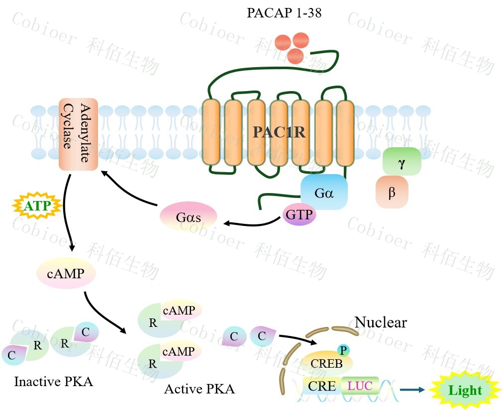 PAC1R CRE-Luc HEK293 報告基因藥靶模型很好的模擬了體內 PAC1R 的信號轉導過程,原理見下圖所示。![]() Figure 1. PAC1R CRE-Luc HEK293 細胞模型原理圖 |