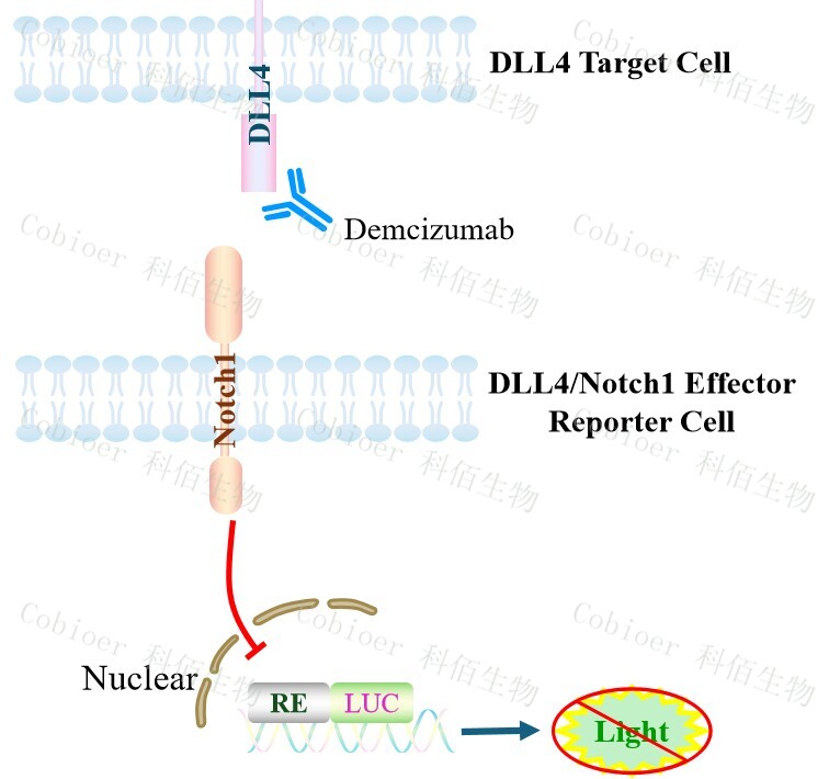 DLL4/Notch1 Effector Reporter Cell 報告基因藥靶模型很好的模擬了體內 DLL4/Notch1 的信號轉導過程,原理見下圖所示。