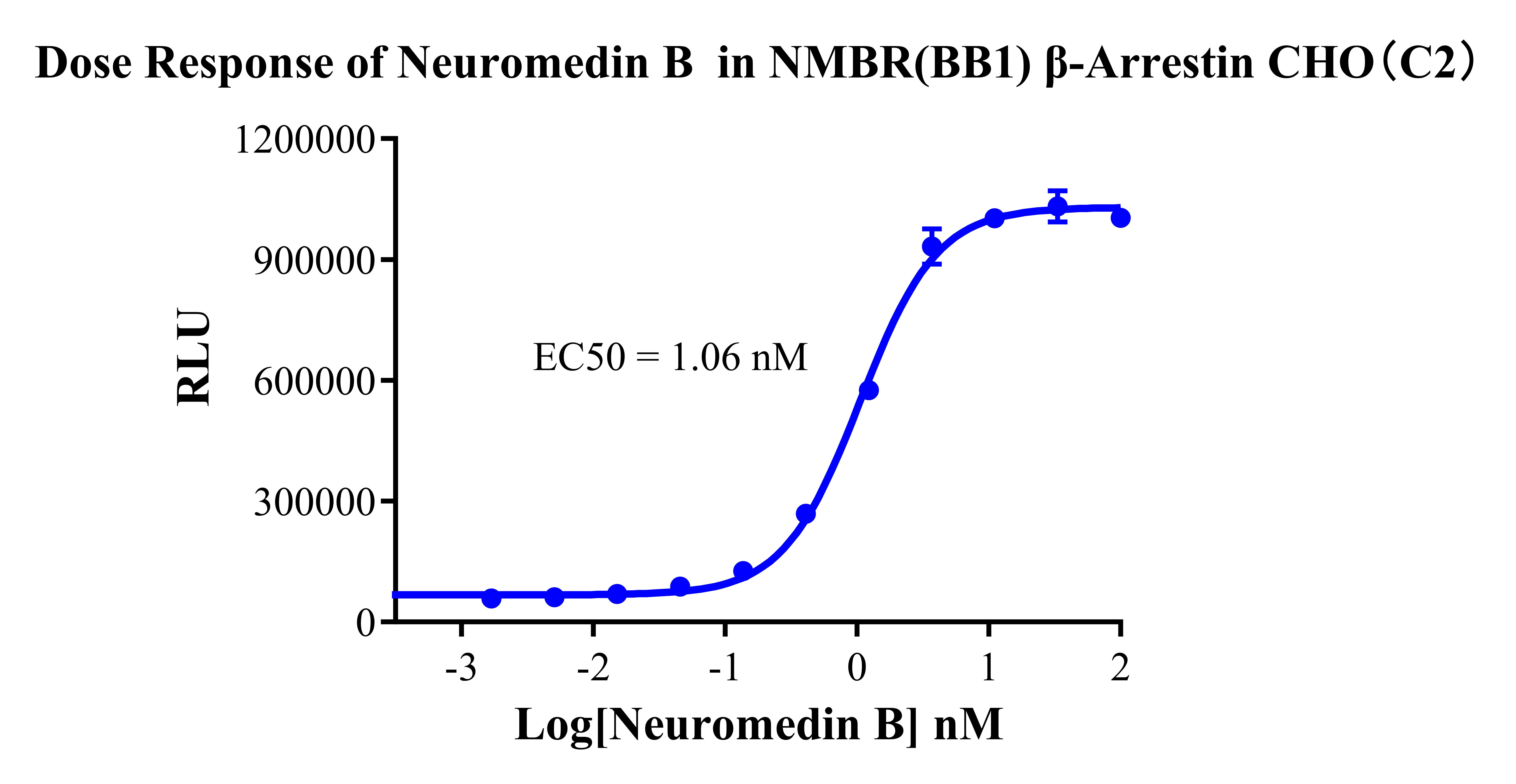 NMBR(BB1) β-Arrestin CHO 報告基因藥靶模型很好的模擬了體內 NMBR/β-Arrestin 的信號轉導過程,原理見下圖所示。當缺乏配體刺激時,β-Arrestin 不與 NMBR 結合,融合β- Arrestin 的熒光素酶處于失活構象,當 NMBR 遭遇配體刺激時,融合熒光素酶報告基因的 β-Arrestin 被招募,使熒光素酶報告基因處于激活狀態,加入其底物后發光信號增強。![]() Figure 1. NMBR(BB1) β-Arrestin CHO 細胞模型原理圖 |