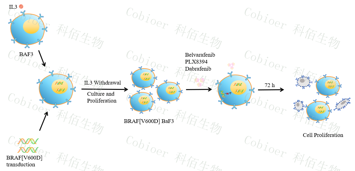 BaF3(小鼠原 B 細胞)的生長和增殖需要 IL-3 的維持。通過引入各種表達激酶的基因, 能作為 BaF3 的驅動基因,讓 BaF3 不再依賴 IL-3 而增殖,進而激酶基因成為 BaF3 增殖依 賴的驅動基因,用于評估小分子藥物對激酶的靶向抑制作用,原理及流程見下圖所示。