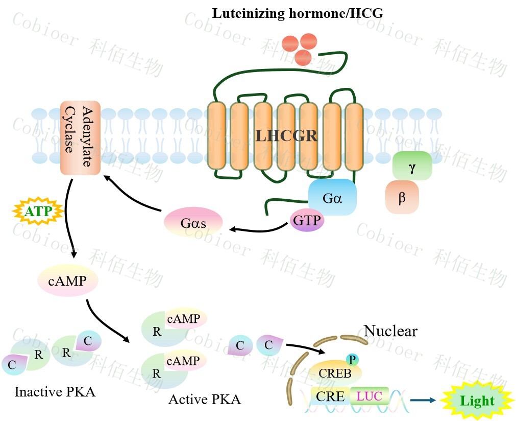 LHCGR CRE-Luc HEK293 報告基因藥靶模型很好的模擬了體內 LHCGR 的信號轉導過程,原理見下圖所示。![]() Figure 1. LHCGR CRE-Luc HEK293 細胞模型原理圖 |