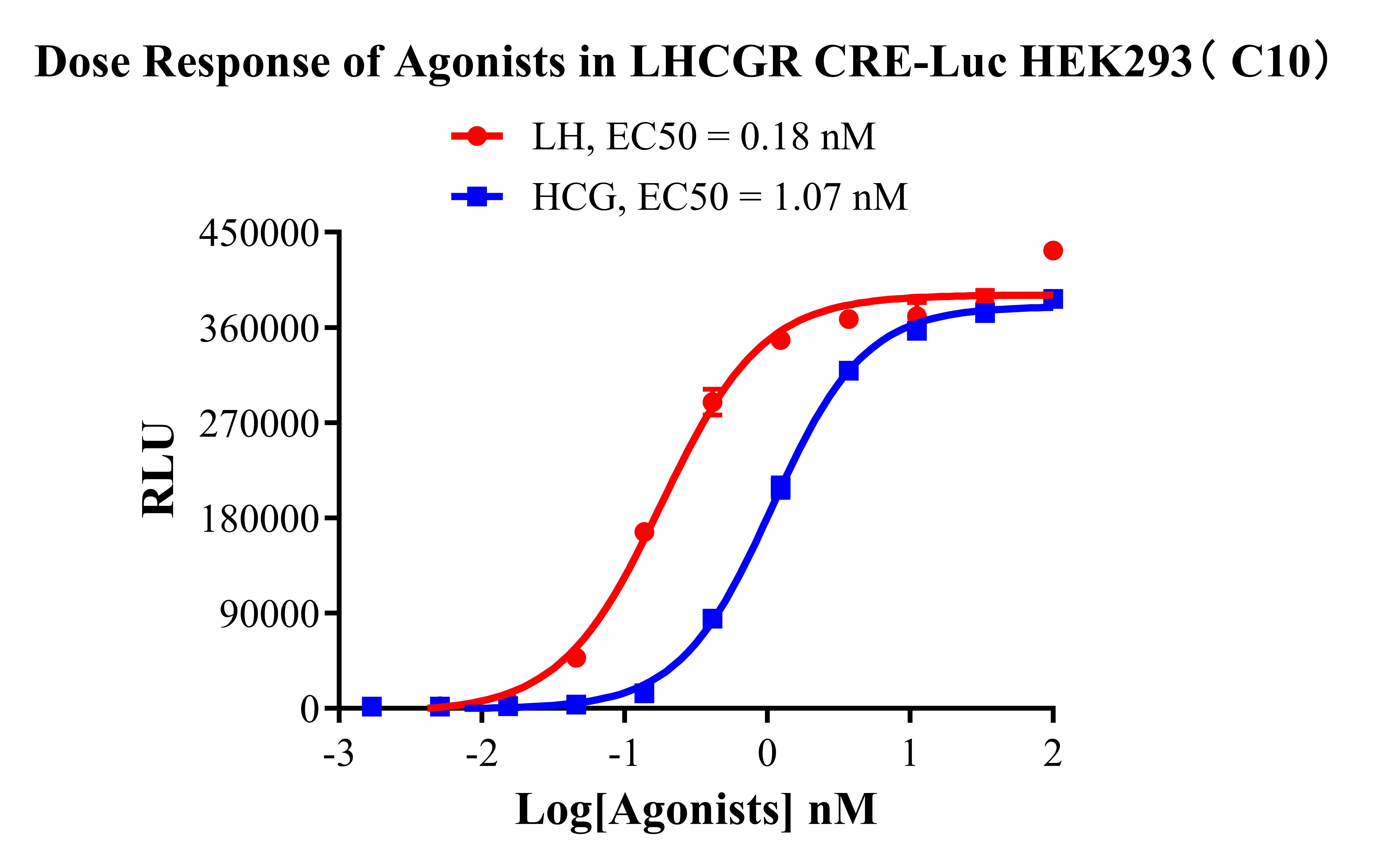 Figure 2. Detect Luciferase assay by Ultra Luciferase Detection Kit CBPH0001(we strongly suggest to purchase from Cobioer). Dose Response of Agonists in LHCGR CRE-Luc HEK293(C10).