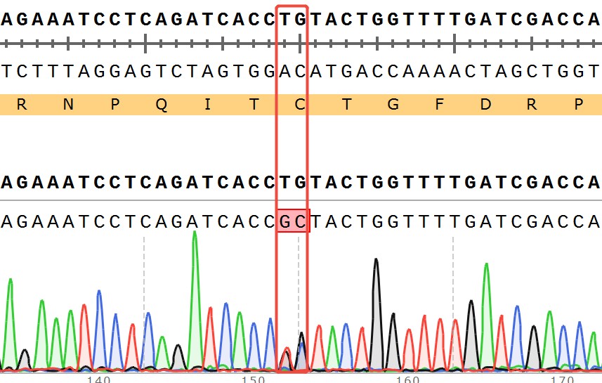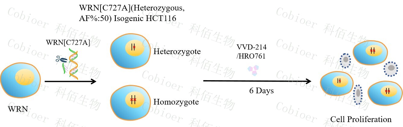 WRN[C727A](Heterozygous,AF%:50) Isogenic HCT116 藥靶細胞,通過基 因編輯的方式將 WRN 的 727 位氨基酸胱氨酸(C)突變為丙氨酸(A)。![]() Figure 1. WRN[C727A](Heterozygous,AF%:50) Isogenic HCT116 原理示意圖 |