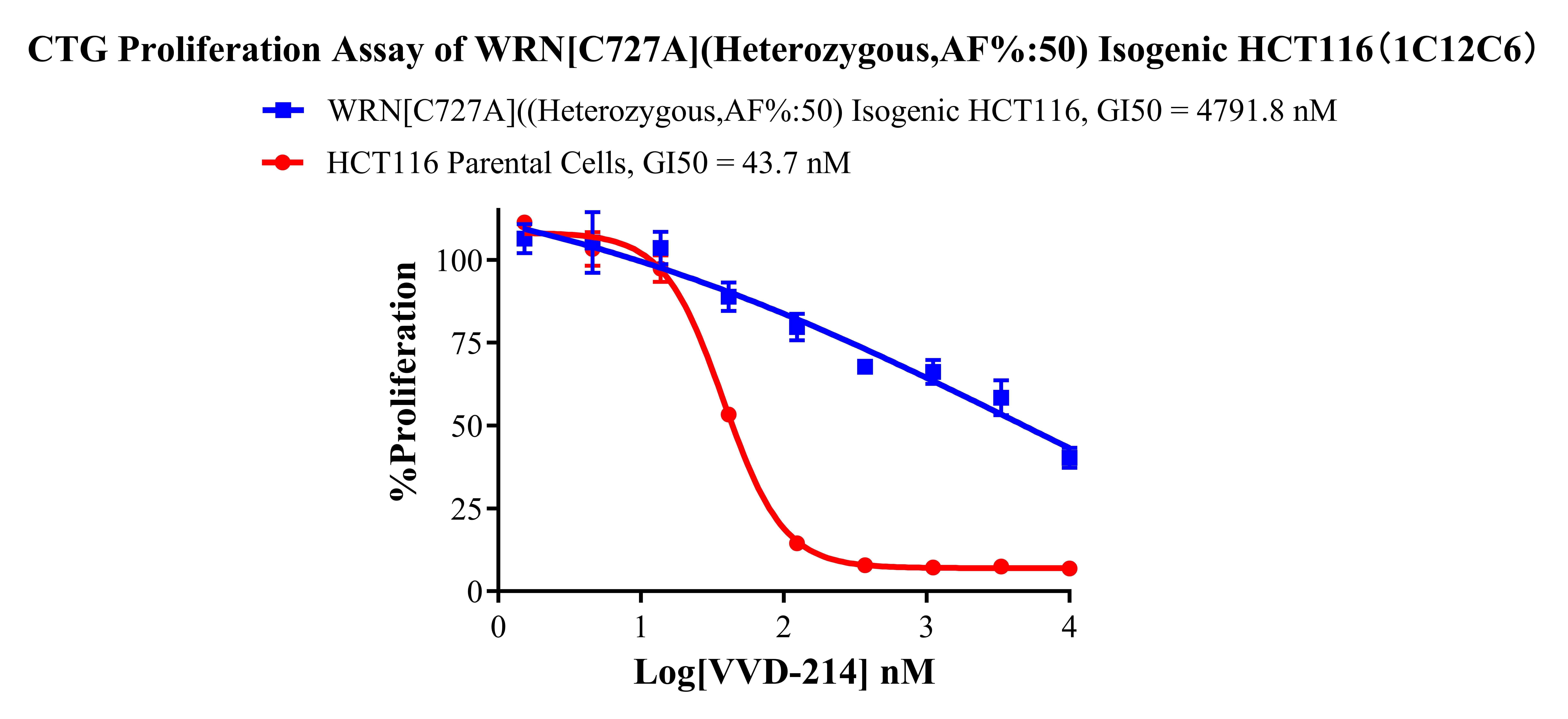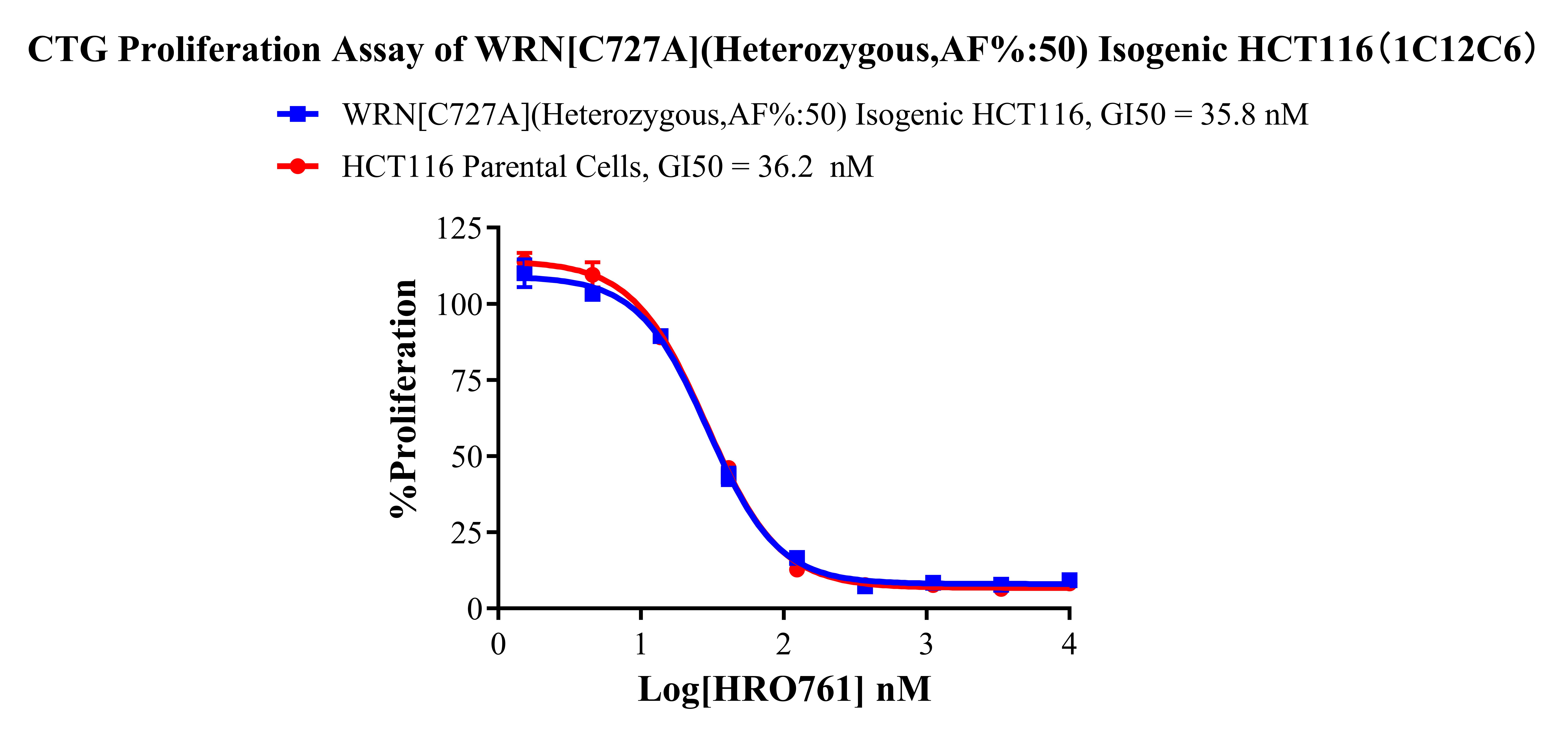 Figure 2. Sanger of WRN[C727A](Heterozygous,AF%:50) Isogenic HCT116![]() Figure 3. A:HCT116 Parental Cell;B:WRN[C727A](Heterozygous,AF%:50) Isogenic HCT116 通道2 藍色微滴代表WRN[C727A]突變陽性,通道2 綠色微滴代表該位點為陰性野生型 ![]() Figure 4. CTG Proliferation Assay of WRN[C727A](Heterozygous,AF%:50) Isogenic HCT116(1C12C6). ![]() Figure 5. CTC Proliferation Assay of WRN[C727A](Heterozygous,AF%:50) lsogenic HCT116(1C12C6). |