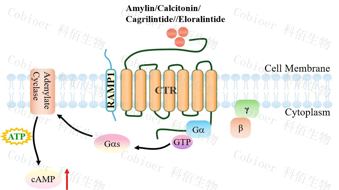 | 降鈣素基因相關(guān)肽(CGRP)家族包括 CGRP 本身、降鈣素(CT)、腎上腺髓質(zhì)素 (AM)和胰島淀粉樣肽(AMY)。 胰淀素(Amylin)受體的三種類型的已被確定,即 AMY1,AMY2 和 AMY3。胰淀素 受體屬于 B 類 GPCR,是異二聚體復(fù)合物,由降鈣素受體(CTR)與受體活性修飾蛋白 (RAMPs)結(jié)合形成。該受體的 CTR 組分具有相同的 GPCR 結(jié)構(gòu):7 個跨膜相互連接的α- 螺旋,將細胞外信號傳遞到細胞內(nèi)細胞質(zhì)信號級聯(lián)。RAMP 有三種類型(RAMP1、 RAMP2 和 RAMP3),它們共享 31%的氨基酸序列,具有相似的基本結(jié)構(gòu)。RAMP 是將 CTR 轉(zhuǎn)運到細胞膜并調(diào)節(jié)其配體特異性的重要肽,它可以改變特定 GPCR 的藥理學(xué)、功能 和細胞運輸。 哺乳動物細胞中 Amylin 受體的激活已被證明可以提高 cAMP,并被認為與 Gs 蛋白和 腺苷酸環(huán)化酶的刺激有關(guān)。在 RAMPs 的存在下,其與胰淀素的結(jié)合親和力可以被修飾。 CTR 和 RAMP1 或 CTR 和 RAMP3 的異質(zhì)結(jié)構(gòu)被認為有利于與胰淀素結(jié)合,介導(dǎo)大腦中的 生理功能。AMY3 的激活刺激 G 蛋白 Gαs,進一步控制腺苷酸環(huán)化酶(AC),隨后增加細 胞 cAMP。cAMP 與 PKA 調(diào)控亞基(R2)的結(jié)合誘導(dǎo) PKA 四聚體全酶解離,導(dǎo)致 PKA 催 化亞基的激活。cAMP 激活的 PKA 參與調(diào)控 ERK1/2 的活性。ERK1/2 通路的觸發(fā)可能導(dǎo)致 Ca 2+分布不均勻,引發(fā)內(nèi)質(zhì)網(wǎng)和線粒體功能障礙,導(dǎo)致細胞死亡。此外,cAMP 刺激 AKT 進一步導(dǎo)致轉(zhuǎn)錄因子 cFos 的表達。 |