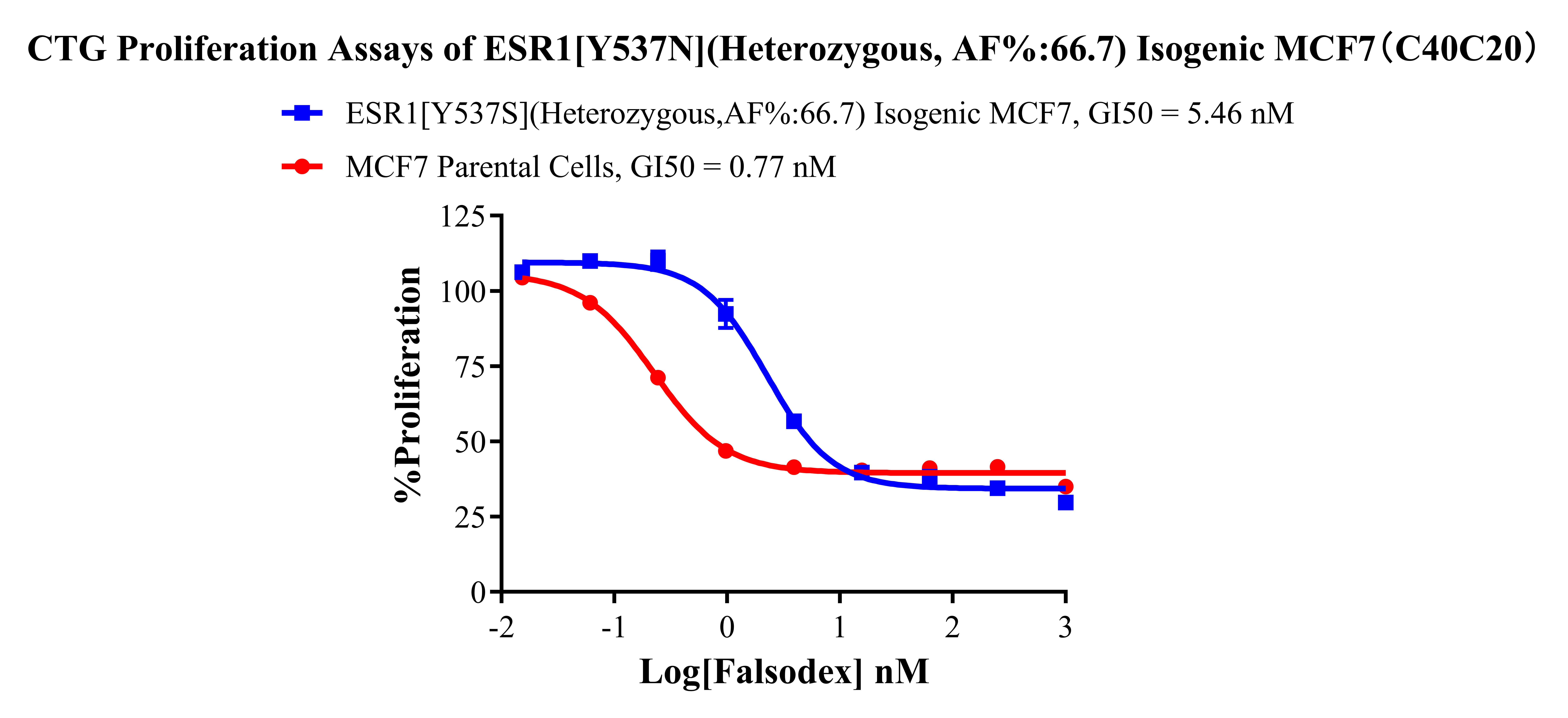![]() Figure 2. Sanger of ESR1[Y537N](Heterozygous,AF%:66.7)Isogenic MCF7 ![]() Figure 3. A: MCF7 Parental Cell;B:ESR1[Y537N](Heterozygous,AF%:66.7) Isogenic MCF7 通道2 藍色微滴代表ESR1[Y537N]突變陽性,通道2 綠色微滴代表該位點為陰性野生型 ![]() Figure 4. CTG Proliferation Assays of ESR1 [Y537N](Heterozygous, AF%:66.7) 1sogenic MCF7(C40C20). |