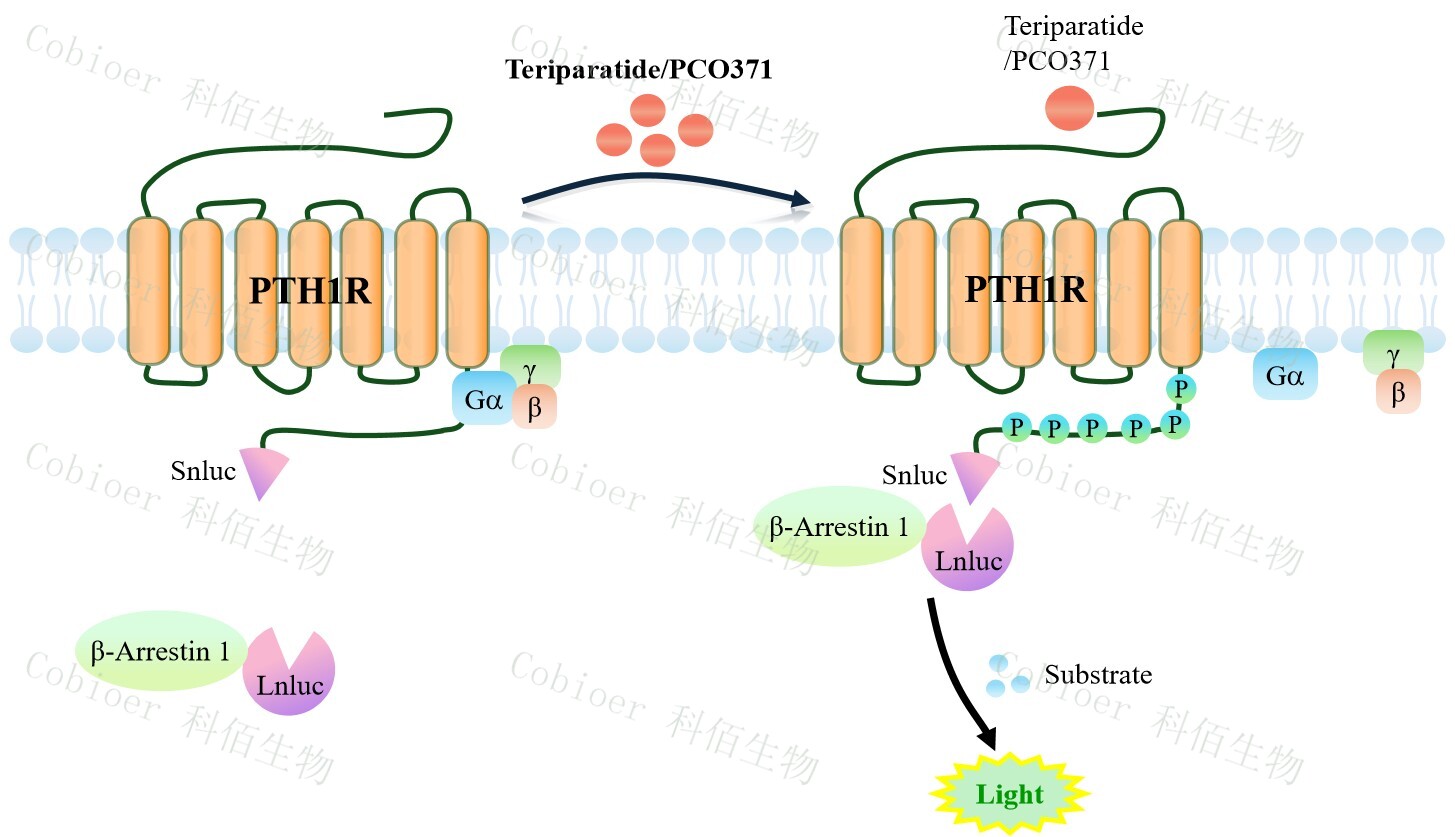 PTH1R β-Arrestin 1 CHO 報告基因藥靶模型很好的模擬了體內 PTH1R/β-Arrestin 1 的信號轉導過程,原理見下圖所示。當缺乏配體刺激時,β-Arrestin 1 不與 PTH1R 結合,融合β- Arrestin 1 的熒光素酶處于失活構象,當 PTH1R 遭遇配體刺激時,融合熒光素酶報告基因 的β-Arrestin 1 被招募,使熒光素酶報告基因處于激活狀態,加入其底物后發光信號增強。![]() Figure 1. PTH1R β-Arrestin 1 CHO 細胞模型原理圖 |