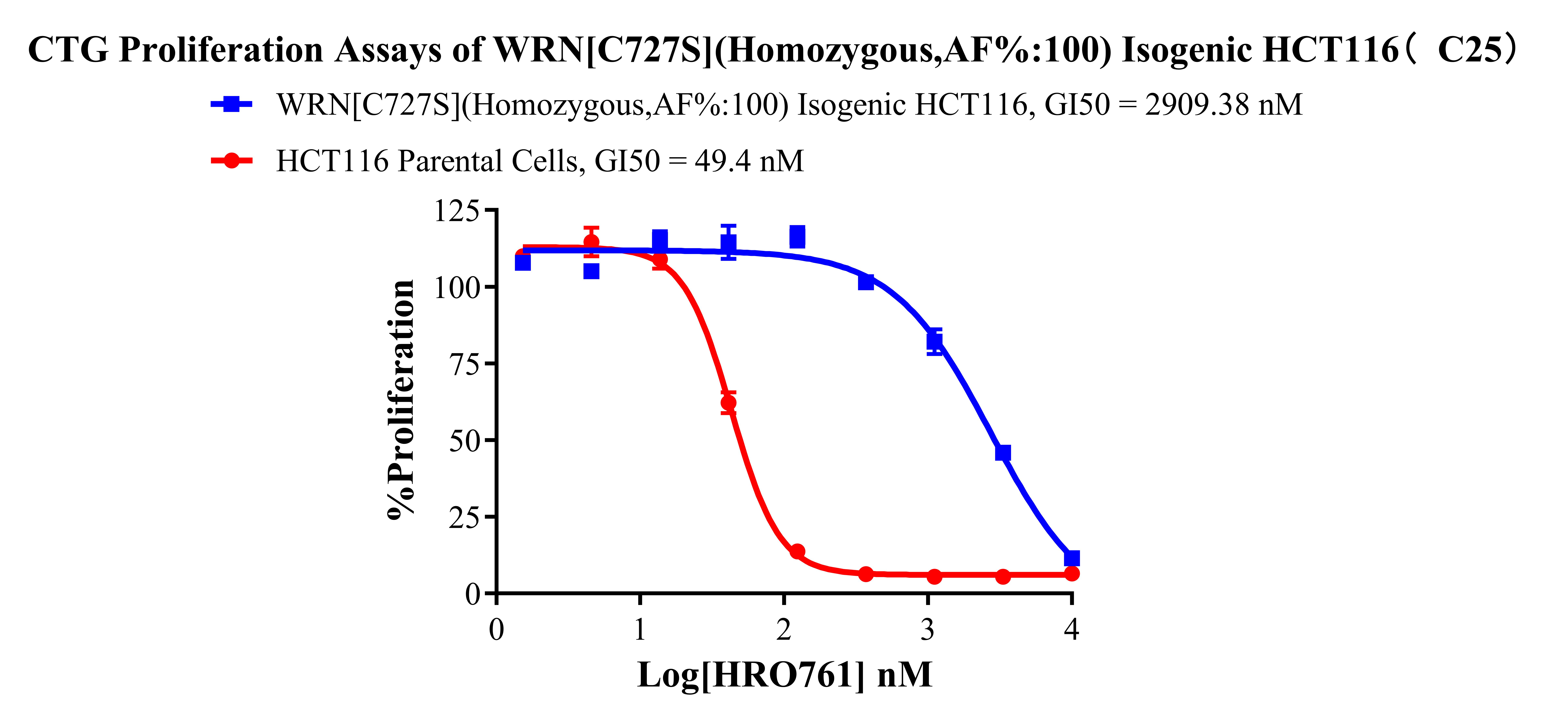 ![]() Figure 1. A:HCT116 Parental Cell;B:WRN[C727S](Homozygous,AF%:100) Isogenic HCT116 通道2 藍色微滴代表WRN[C727S]突變陽性,通道2 綠色微滴代表該位點為陰性野生型 ![]() Figure 2. CTG Proliferation Assays of WRN[C727S](Homozygous,AF%:100)Isogenic HCT116(C25). ![]() Figure 3. CTG Proliferation Assays of WRN[C727S](Homozygous,AF%:100) Isogenic HCT116(C25). |