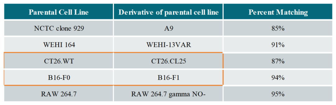 1. B16-F0、B16-F1等衍生細胞系STR匹配度>90%,無法區分。